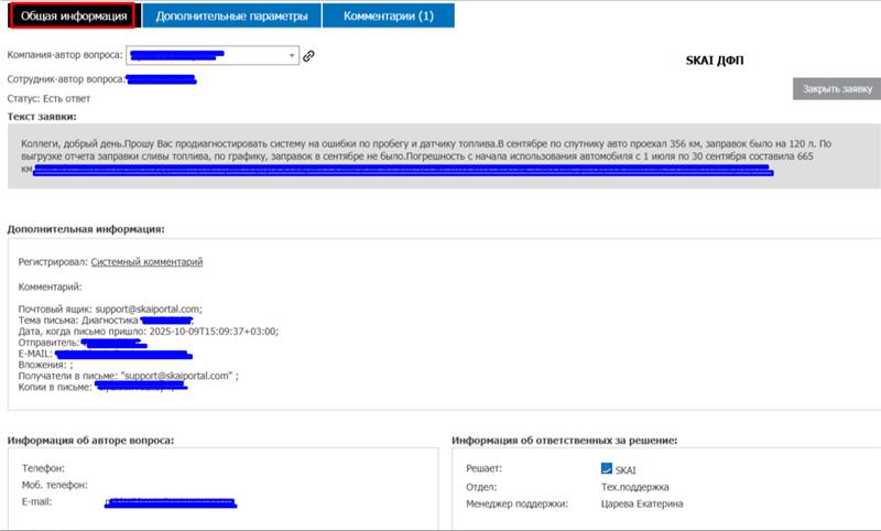 - Общая информация - содержит информацию по изначальному вопросу (кто регистрировал заявку, текст заявки, тема и так далее).