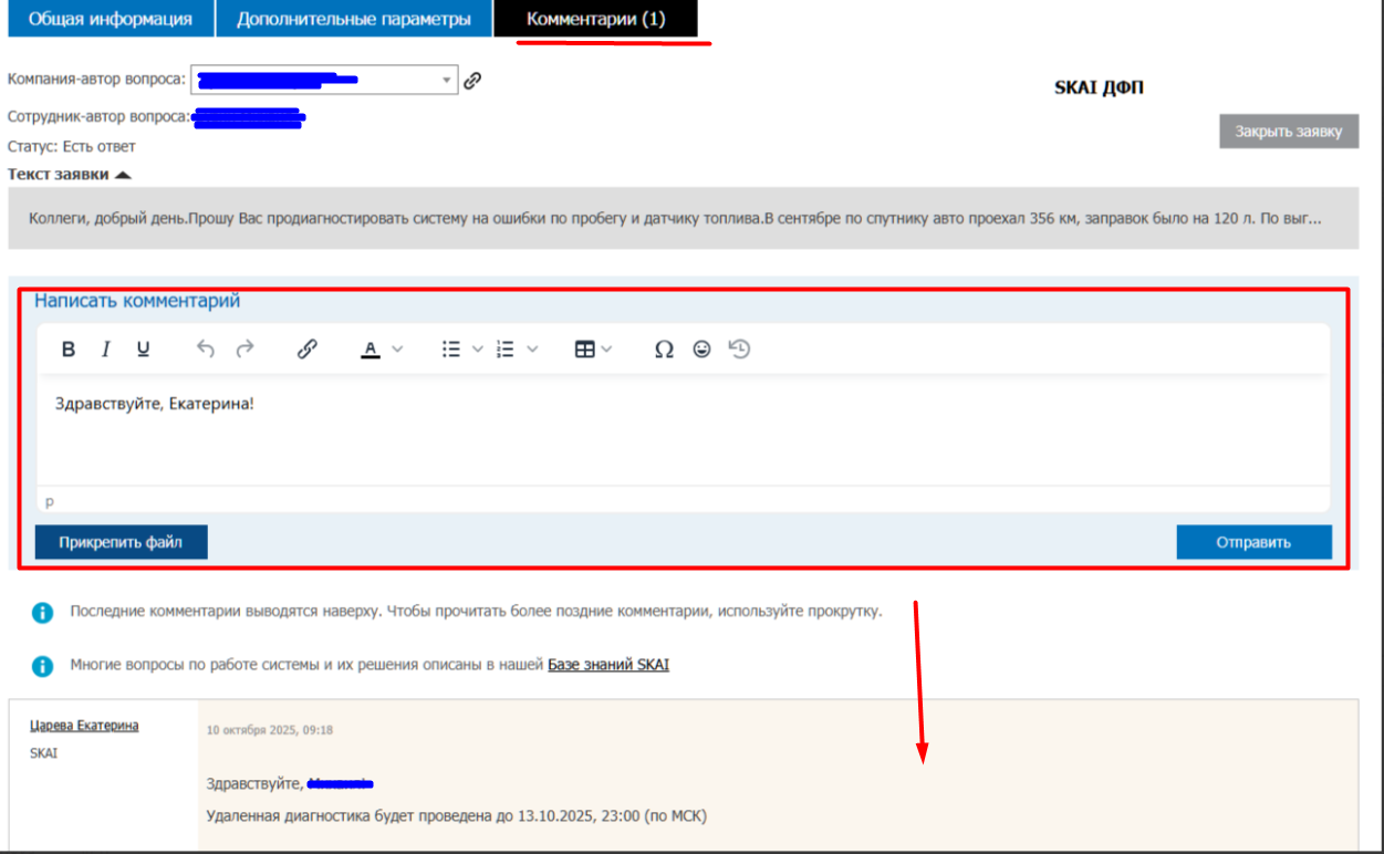 - Комментарии - блок, в котором можно написать комментарий по заявке, а также посмотреть историю с ходом работы по заявке.