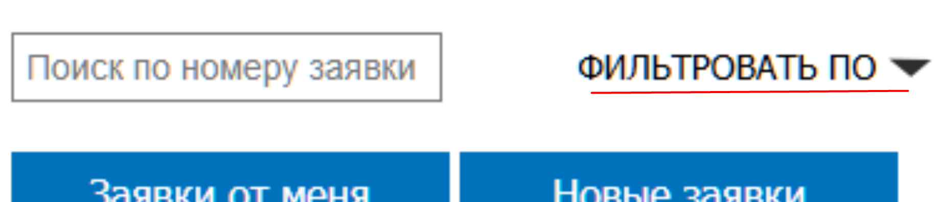 В блоке со списком заявок находится раскрывающийся список "Фильтровать по", нажав на эту кнопку, раскроются фильтры, по которым можно отыскать необходимую Вам информацию.