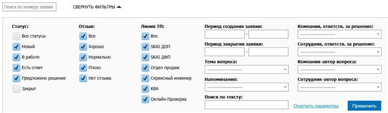Вы можете найти заявку по множеству фильтров (номер заявки, статус, отзыв, текст в заявке и так далее):
