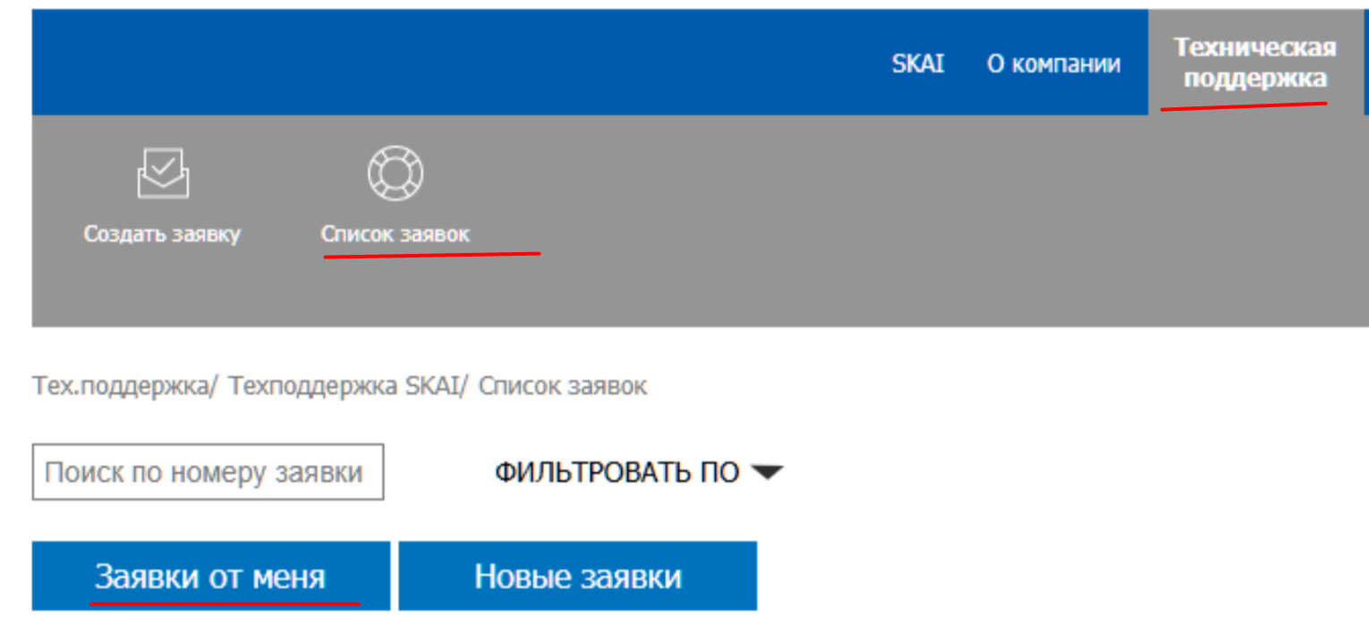 В блоке "Заявки от меня" находятся все заявки, созданные Вами. Также, Вы можете найти конкретную заявку по номеру заявки, вписав его в соответствующее поле "Поиск по номеру заявки".